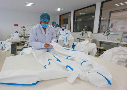 从接到任务到确定选址、改造车间、筹备物资、培训技术,再到生产出工业级防护服第一件样品,柒牌集团只用了6天时间。(吴宗宝 摄)