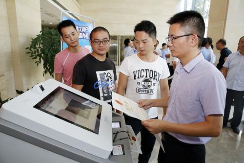 2018年8月,福建省个体工商户全程智能化登记系统在泉州试点上线运行,个体户从自助打照机取出新鲜出炉的营业执照,感叹太方便了。(陈晓东 摄)