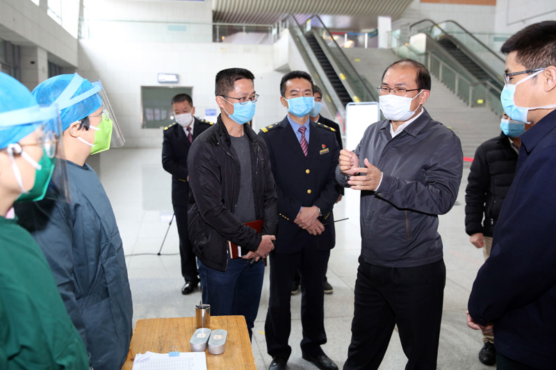 2月6日,市长王永礼前往泉州动车站,看望慰问防控一线工作人员,实地检查疫情防控措施落实情况。(陈晓东 摄)