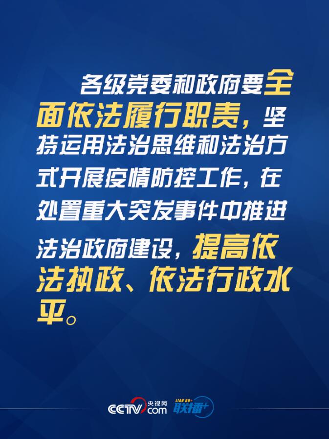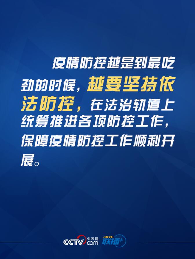 习近平在中央全面依法治国委员会第三次会议上强调,从立法、执法、司法、守法各环节发力,全面提高依法防控、依法治理能力,为疫情防控工作提供有力法治保障,并提出九个“要”: