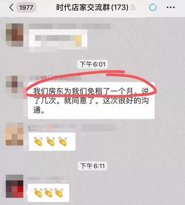 在时代店家交流群里,鼎韵御品店的老板娘说,“沟通了几次,房东同意免一个月租金,这是一次很好的沟通。”