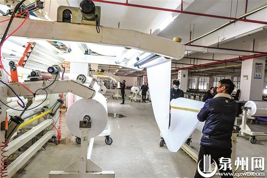 在石狮华用公司,复工的工人正将无孔高透湿膜复合在医用无纺布上。
