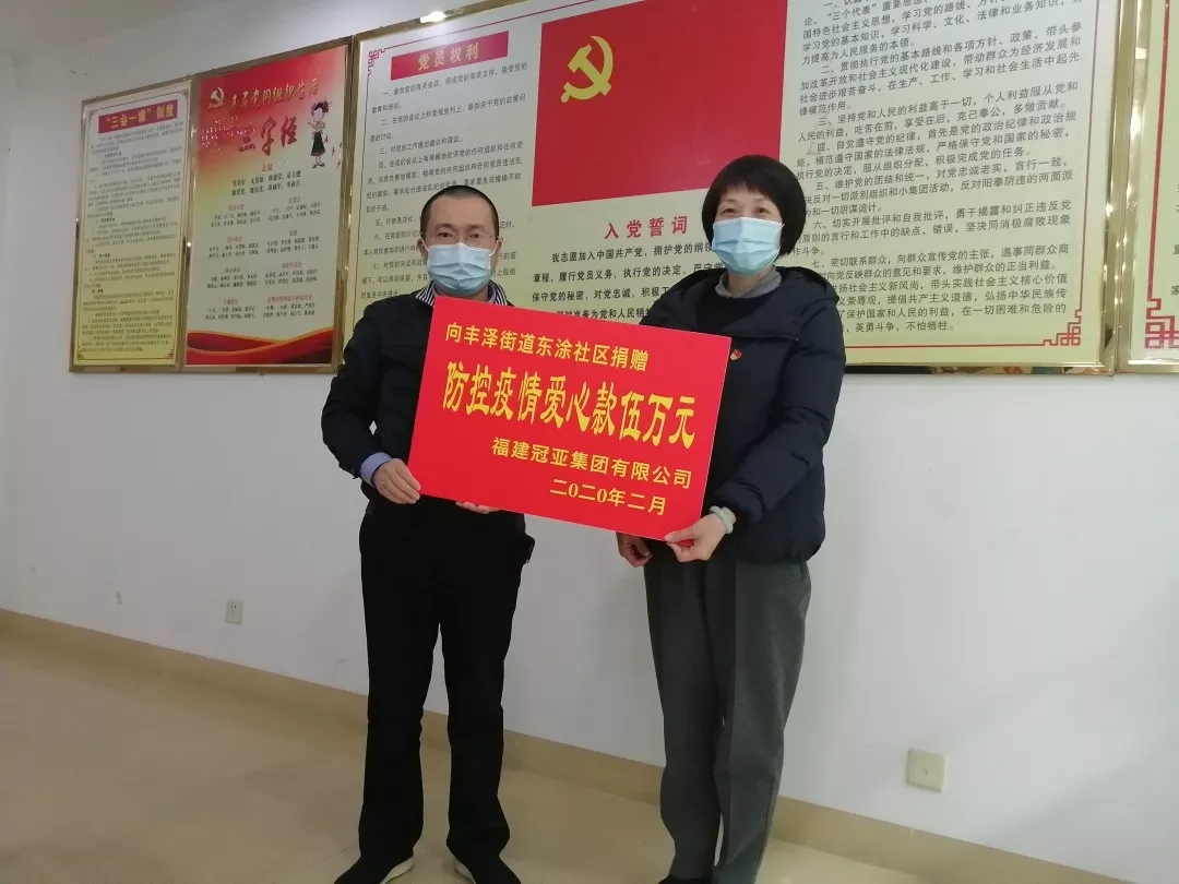 8日下午,福建冠亚集团有限公司向东涂社区捐赠5万元人民币,支援基层防控工作,助力抗击疫情。“突如其来的疫情打乱了新春佳节的祥和氛围,所有人都在为抗击疫情出一份力。感谢不辞辛苦奋斗在抗疫一线的社区工作者,作为辖区的企业,希望能够为社会做点事,为抗击疫情贡献自己一丝微薄的力量。”冠亚集团负责人说道。