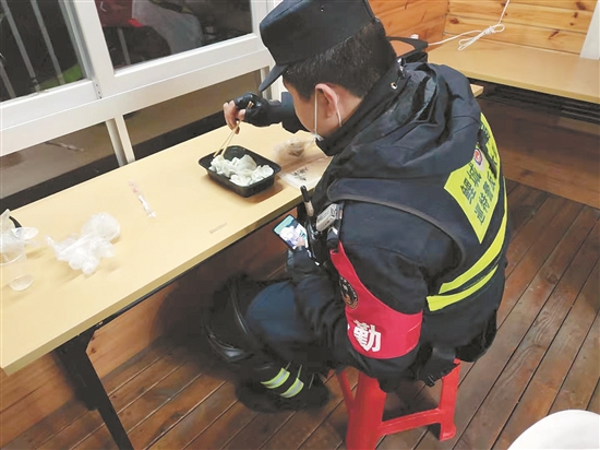 由于有检查任务,执法队员没来得及立刻吃热乎乎饺子,就回到了各自的岗位上,直到晚上11点多,他们才停歇下来吃水饺。站外刺骨的寒风中,大家的心却是热乎的。
