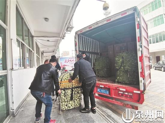 泉州网2月11日讯 (记者张晓明 通讯员王诗伟 张莉静 文/图)花菜、辣椒、莴笋、萝卜、油麦菜、生菜、上海青、大白菜……日前,4辆大货车上把一筐筐刚刚采摘的蔬菜送到了晋江市永和镇机关大院。“特殊时期,我们也想贡献一份微薄之力。”带队捐蔬菜的闽皖辣椒种植农业合作社负责人芮超玉说,希望将这些蔬菜免费送提供全镇范围内的居家隔离留观人员。