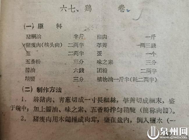 钟明选收藏的福建第一本各地区菜谱中,关于泉州特色菜鸡卷的做法。
