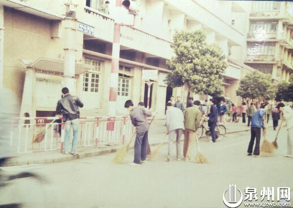 上世纪80年代,学生上街参加义务劳动。泉州饭店二楼上可以看到站着叉腰注视街面的人。饭店外还有座阅报栏,方便市民及时了解国内外新闻。