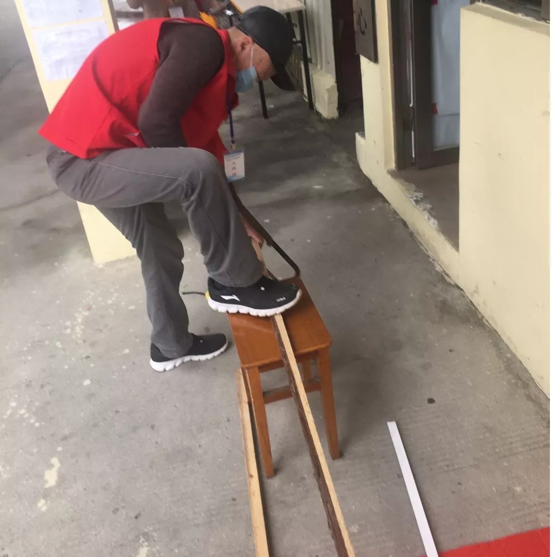 14 日上午,城东街道泉铁社区舆情员施性财刚上班就嘀咕着:“天气这么差,我们是不是做一个消毒池,让进入小区的居民鞋底消毒后,可以安全回家。”话刚落,只见他就地取材,拿起几根木棍、椅子、锯子、鲁班尺,手脚麻利地把消毒池的结构给做好了。紧接着,社区工作人员拿起铁锤、铁钉忙了起来。施性财说:“在这特殊的日子(情人节),我们让每个居民踩上红地毯安心地回家。”