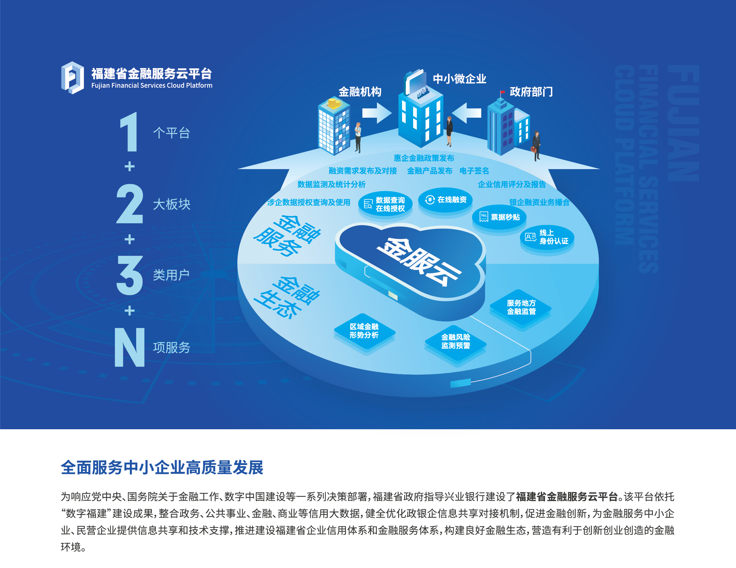 据介绍,“金服云”平台是由省政府指导、省金融监管局和省数字办联合推动,兴业银行建设的综合金融服务平台。平台通过汇聚工商、税务、电力人社、公安等单位和第三方数据,进一步建成金融数据资源中心,打造政务金融数据合规应用授权体系,可实现数据挖掘、金融风控、信用评估等多样化数据服务,旨在进一步解决银企信息不对称问题,缓解中小微企业融资难、融资慢、融资贵。