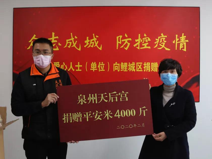 19日下午,在鲤城区“众志成城 防控疫情”社会爱心人士(单位)捐赠仪式上,泉州天后宫捐赠了4000斤“平安米”,还准备了1000份天后宫主题文创产品,送给抗疫一线医护人员。捐赠仪式现场,副区长张刺治代表鲤城区防控新冠肺炎疫情应急指挥部向泉州天后宫送上感谢信,称赞此举彰显了“人道、博爱、奉献”的大爱精神,体现了共克时艰、守望相助的高尚情怀,并表示将及时把捐赠物资发放到疫情防控一线人员手中。