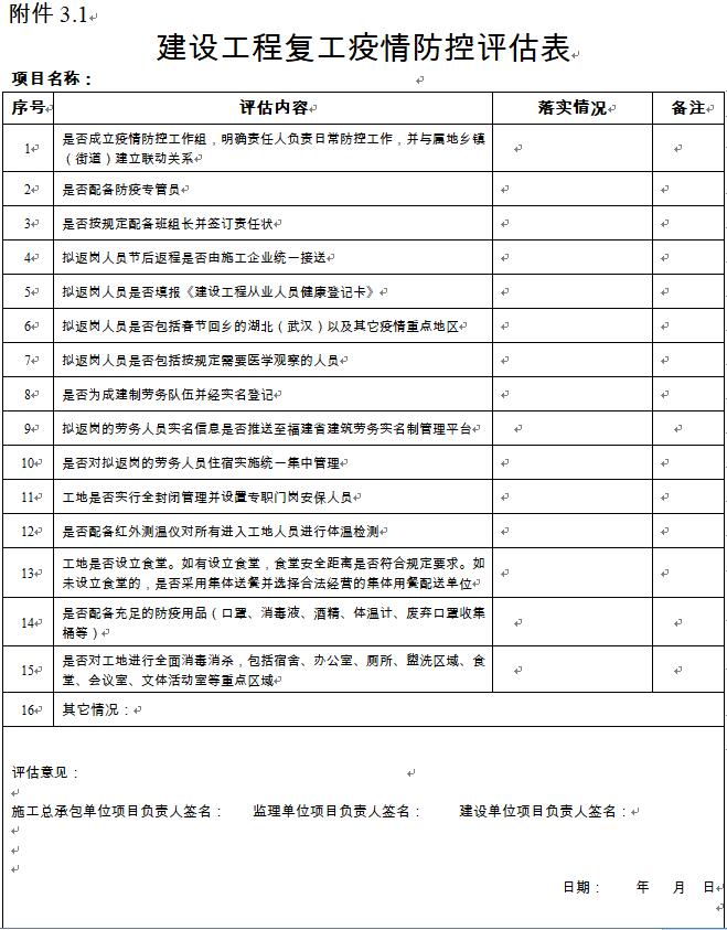 (一)推动项目复工。复工前,建设单位应落实主体责任,组织施工单位、监理单位对工地疫情防控措施和安全生产条件进行全面评估,并形成《建设工程复工疫情防控评估表》(详见附件3.1)。以县域为单元,无疫情区和零星散发疫情区的项目,在做好防控安全工作的基础上,可自行复工。一般疫情区和较多病例疫情区的项目,各县(市、区)要简化企业、项目复工复产程序,推动项目尽快复工。