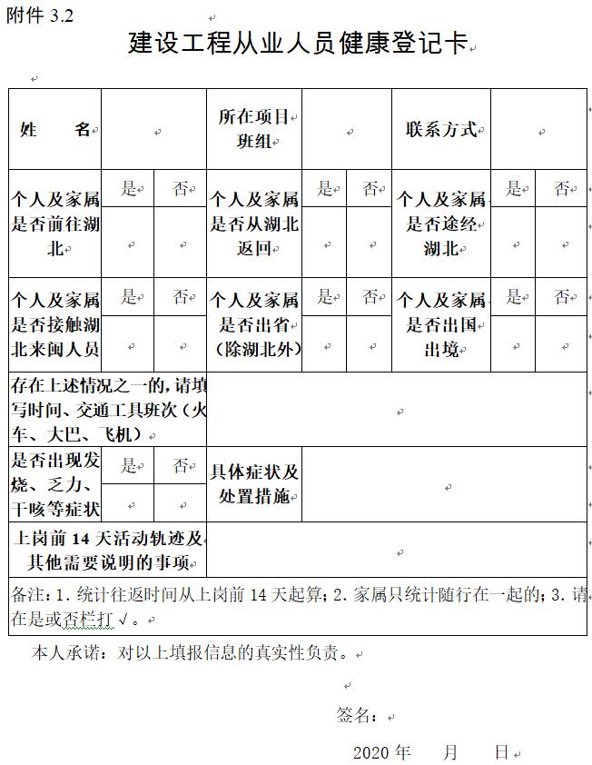 (一)建立相关制度。施工总承包单位要督促从业人员如实填报《建设工程从业人员健康登记卡》(详见附件3.2)并造册建档,对瞒报个人健康信息的,严肃追究相关人员责任。各企业、各项目部要结合实际,制订实施具体防控方案,切实做到有效防控,有序复工,分类管理,精准施策。建立疫情日报机制,施工总承包单位实行每日疫情防控“零报告”制度,于每日18:00前向属地主管部门报送项目疫情防控情况。