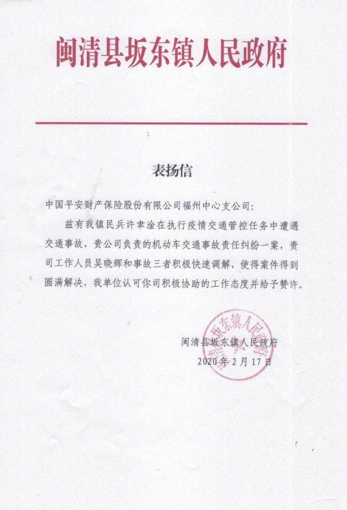 2月3日,客户范先生行车途中不慎与正在执行交通管制任务的车辆发生碰撞,致使在此执勤的许先生受伤。平安产险福州中心支公司接到报案后第一时间展开查勘理赔工作。获悉许先生系因执行疫情管控任务而受伤,平安产险福州中心支公司立即启动绿色通道,积极促成客户与伤者顺利达成调解,同时主动协助收集理赔材料,随后通过线上理赔流程,快速完成伤者理赔款支付。2月17日,闽清县坂东镇人民政府特发函,对平安产险福州中心支公司以实际行动助力一线防疫工作表示赞赏。事后,许先生也通过电话,向平安产险温暖高效的理赔服务表示感谢,并表示他会积极接受治疗,争取早日重返抗疫一线。