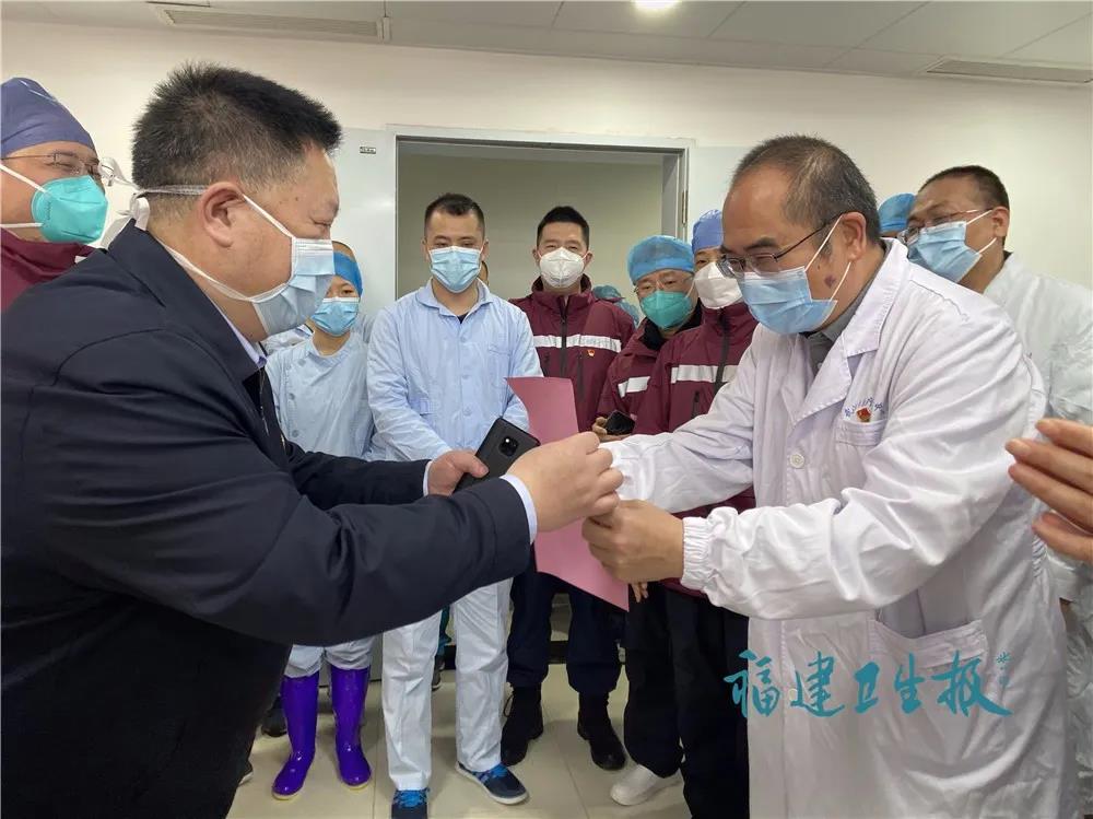 “希望福建第十一批医疗队继续发扬福建队的精神,保持上半场的优势,赢得这场战役的最终胜利!”今天下午,在金银潭医院,福建首批支援湖北医疗队领队宁永鑫铿锵有力地说。即将接管工作的福建第十一批医疗队领队林建清也给即将上阵的队员们加油鼓劲。