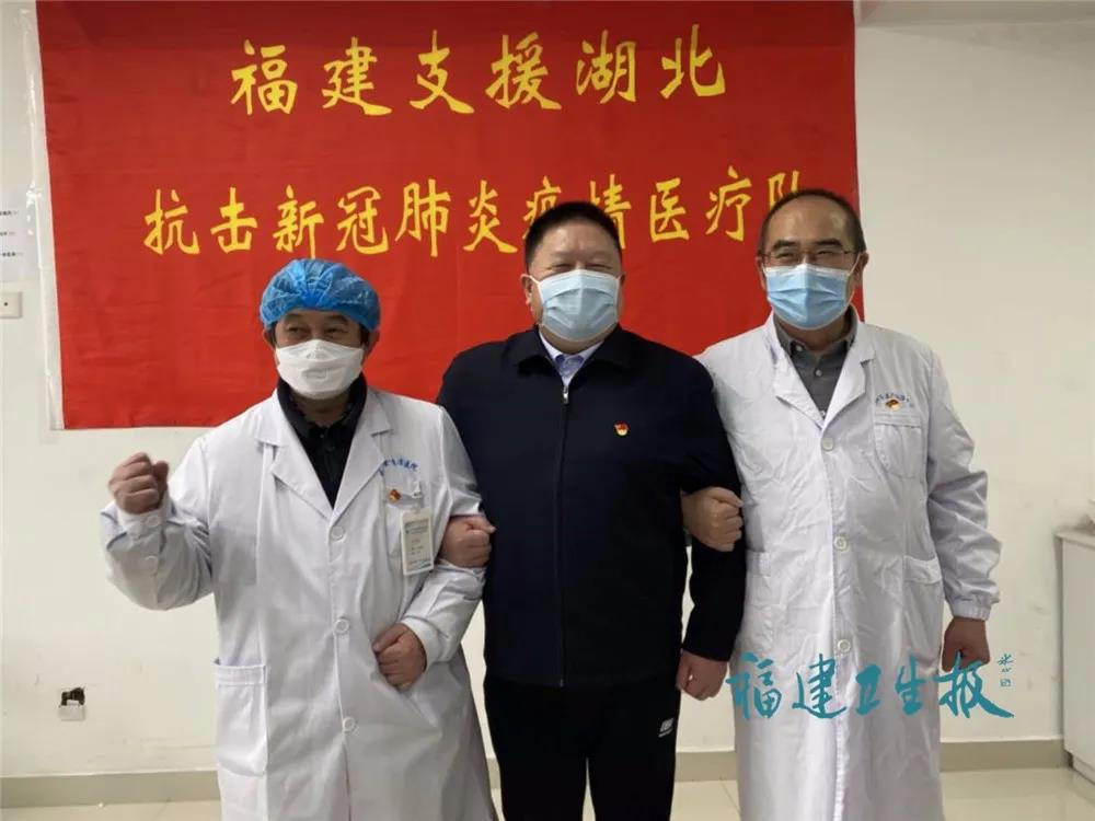 金银潭医院党委书记王先广(左),福建首批支援湖北医疗队领队宁永鑫(中),金银潭医院院长张定宇(右)