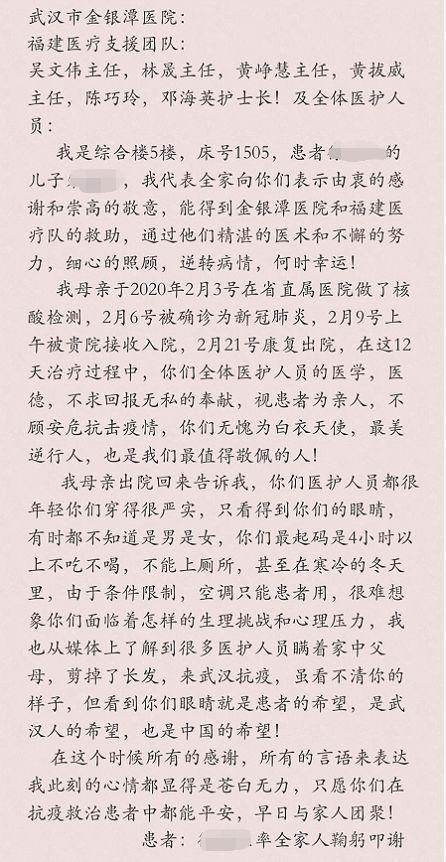 (患者及其家属的感谢信)
