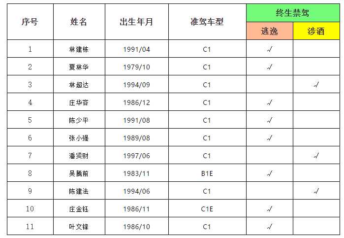 泉州网2月25日讯(记者卢珊珊 通讯员赵美媛)近日,泉州市公安局交警支队向社会公布2020年1月份被吊销机动车驾驶证且终生禁驾的11名驾驶人名单。据了解,其中有8人因交通肇事后逃逸构成犯罪被终生禁驾,3人因醉酒驾驶机动车发生交通事故构成犯罪被终生禁驾。