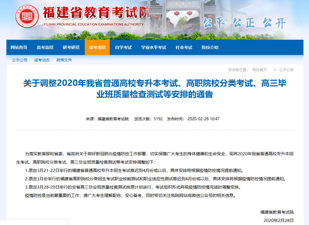 2.原定3月份举行的福建省高职院校分类招生考试职业技能测试和职业适应性测试推迟到4月份或以后,具体安排将根据疫情防控情况提前通知。