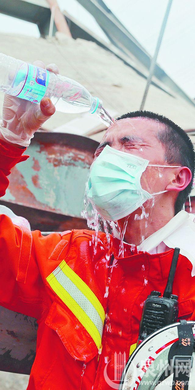 救援太累了,消防员用水降温。