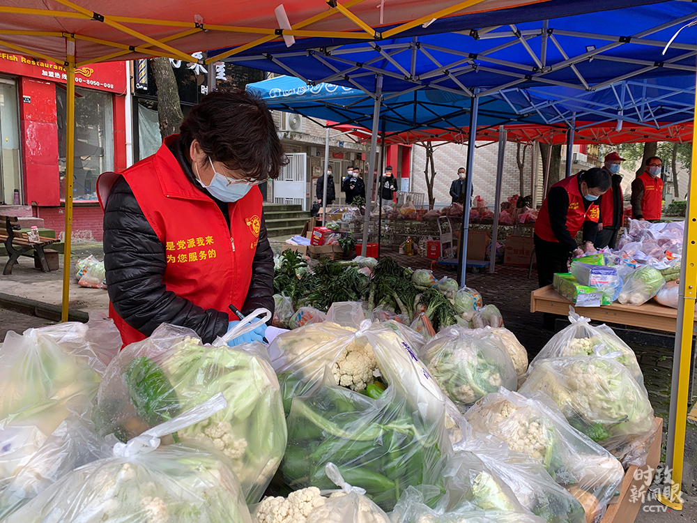 △ 在东湖新城社区集中配送点,既有免费发放给居民的爱心菜,也供应平价蔬菜、米面粮油等生活物资。(总台央视记者段德文拍摄)