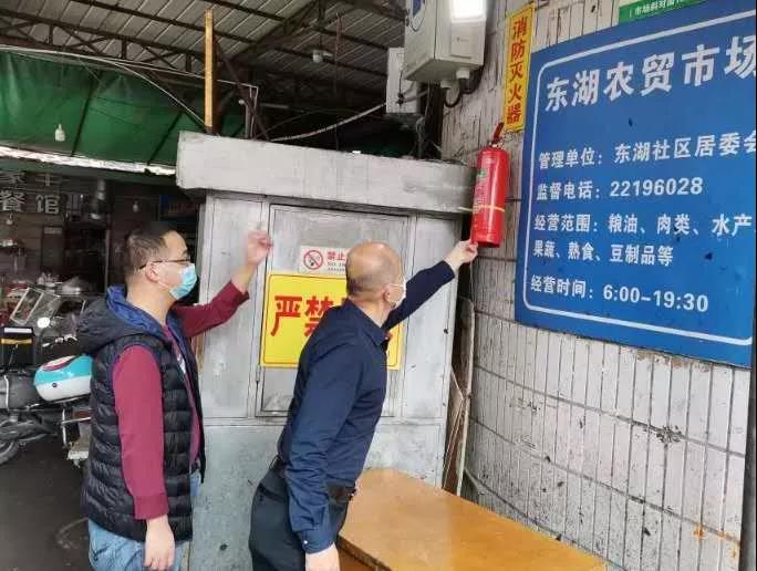 近日,东湖社区开展东湖农贸市场消防安全专项整治行动,摸排调查存在问题,快速开展检查整改工作。截至27日,对5个未封闭配电箱进行封闭并张贴安全使用流程,清理2家经营出售及存入易燃易爆物品摊位,在各进出口及醒目位置制作张贴“严禁烟火”标志28处,增加灭火器10瓶,整理市场内电源明线15条,增加防火套管210多米,疏通东入门、南入门两条消防疏散通道,并在路面画出“消防通道、禁止占用”醒目标识。