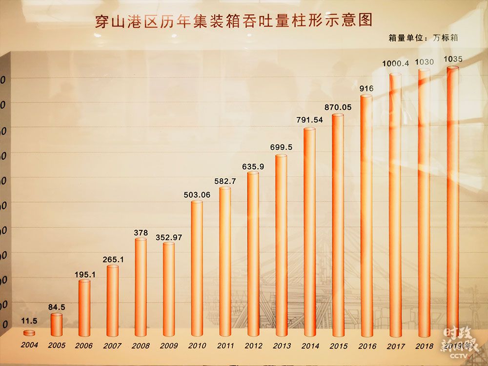 △柱形图清晰展示了2004—2019年穿山港区集装箱吞吐量的增长(总台央视记者史伟拍摄)