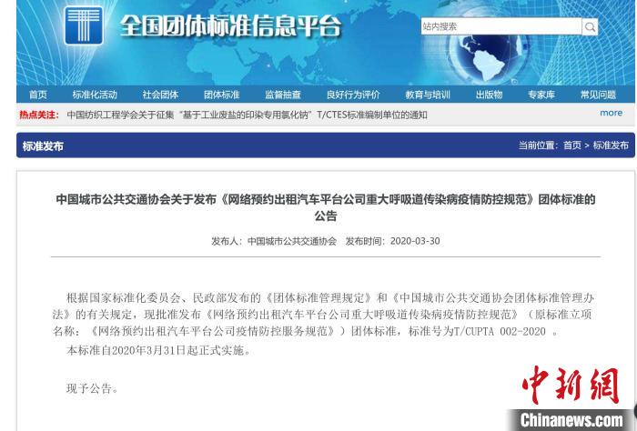 中新网南京3月31日电 (记者 申冉)31日起,由中国城市公共交通协会发布的《网络预约出租汽车(下文简称网约车)平台公司重大呼吸道传染病疫情防控规范》(下文简称《规范》)正式实施。业内专家接受采访时表示,这一团体标准大幅提升了网约车的大数据功能,同时对公共交通工具的消毒标准也提出了新的要求。