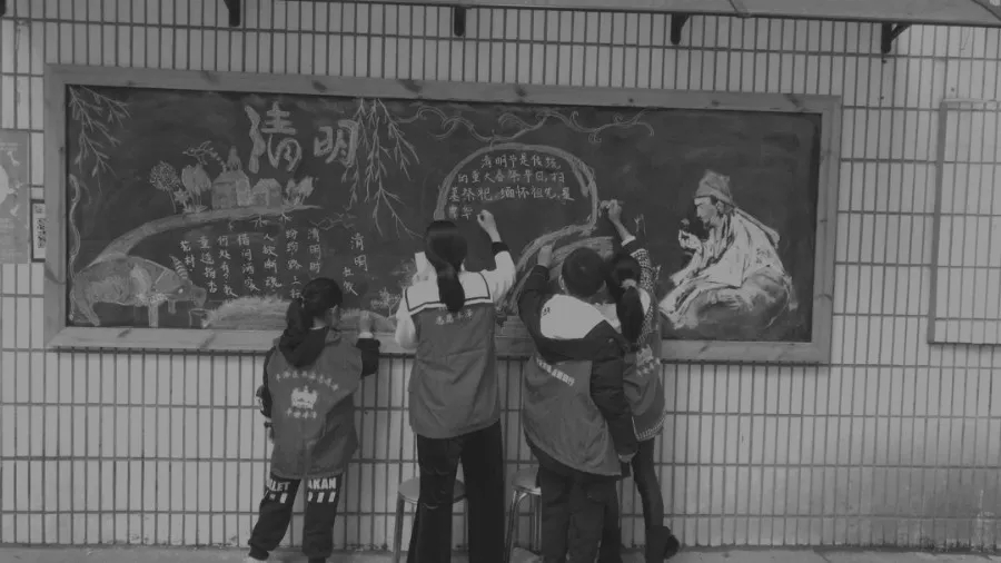 泉秀街道泉淮社区的五个小学生志愿者以清明为主题,构思黑板报,缅怀先烈及先祖。(黄朝岚)