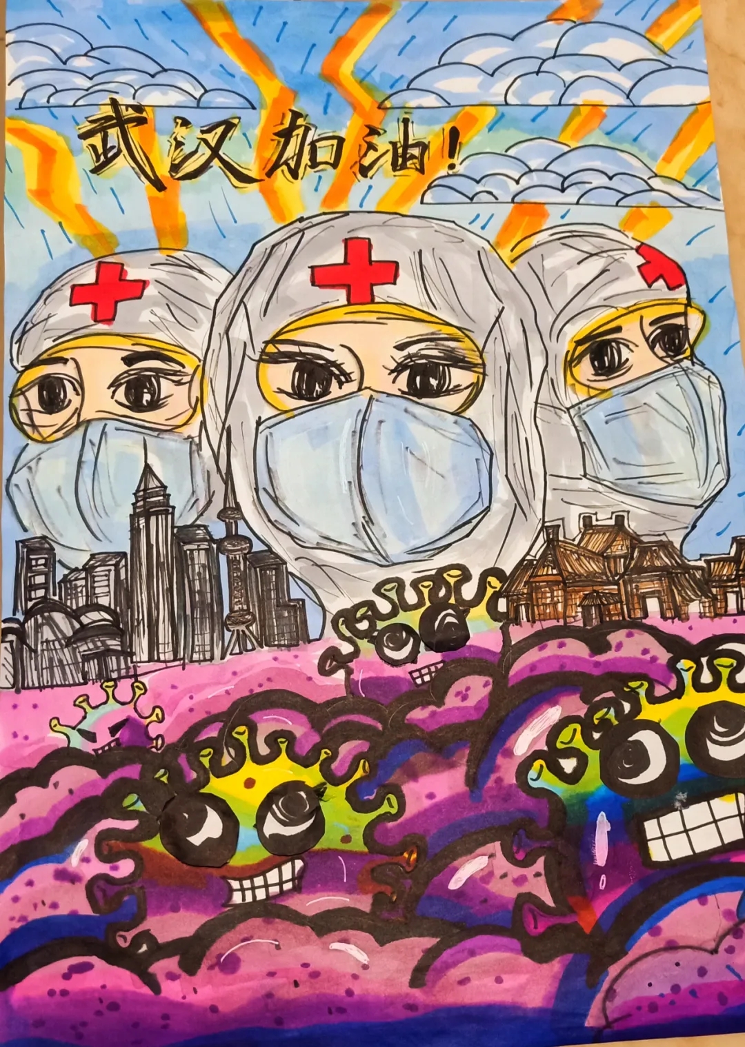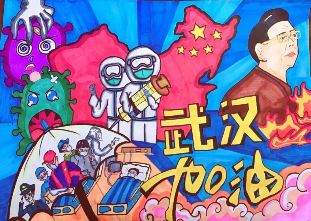 据统计,短短十几天时间征集到原创抗疫主题作品589件,孩子们用画笔绘出温暖与希望,让我们看到了他们眼中的“抗疫世界”,最终220件作品入选抗疫主题美术作品微信展,接下来让我们一起欣赏孩子们的生动画笔。
