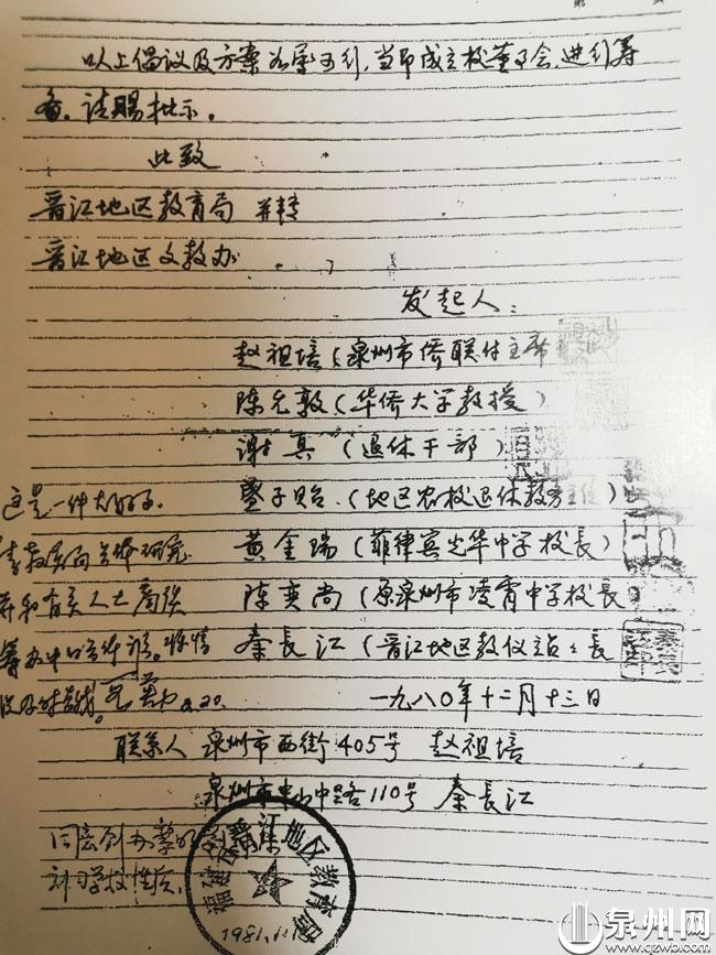 在梁披云大力支持下,1980年12月,赵祖培(曾任黎明高中总务主任,时任泉州市侨联副主席)、陈允敦(华侨大学教授,曾任教黎明高中)、谢真(黎明高中校友)、盛子诒(原晋江地区农校教务主任)、黄金瑞(菲律宾光华中学校长)、陈奕尚(泉州市凌霄中学原校长)、秦长江(时任晋江地区教学仪器站站长)等为发起人,联名提出申请倡办“泉州黎明学园”。