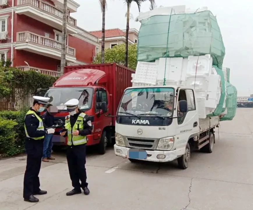 经检查,车上装载的物体为泡沫箱,货物顶端距离地面超过4.5米。交警询问其原因,驾驶员陆某解释为了减少运输成本,且泡沫箱质轻,多拉多挣,所以就接下了这个单,觉得路上慢点不会有什么意外,便心存侥幸地上路了,没想到就被逮个正着。民警依法对陆某驾驶货车超限违法行为作出处罚,责令其将货物超出部分进行卸载转运,并进行了严厉的批评教育。