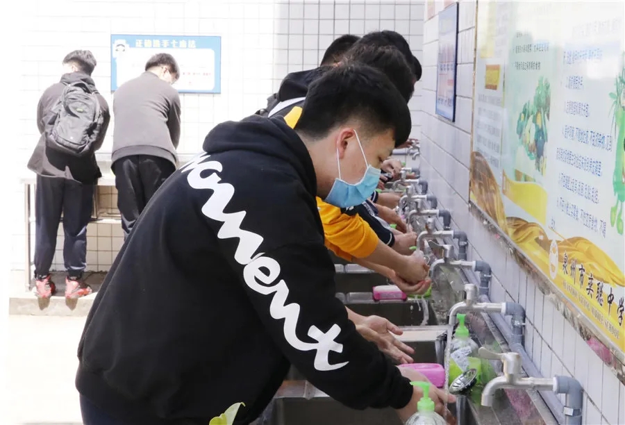 进入校园,正值高三年级学生中午分批就餐时间,学校食堂门口,学生们有序排队进行洗手,随后进入食堂,按照划分好的座位就坐用餐。