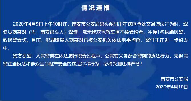 2020年4月9日上午10时许,南安市公安局码头派出所在辖区查处交通违法行为时,驾驶员刘某财(男,南安码头人)驾驶一部无牌灰色轿车拒不接受检查,冲撞1名执勤民警,致民警受伤。目前,犯罪嫌疑人刘某财已被公安机关依法刑事拘留,案件正在进一步侦办中。