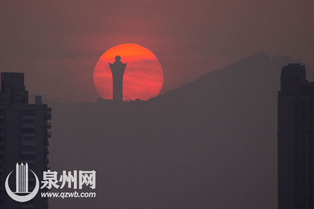 4月15日18时17分,在泉州市区丰海路泉州晋江大桥拍照的记者偶然发现,西沉的太阳钻入紫帽山的山脊线时,正好从气象站雷达塔身后经过,映照出雷达塔轮廓清晰的剪影。拍摄地点与雷达塔的水平直线距离达到了大约14公里,得益于晴好的天气,这个美丽的邂逅在超长焦镜头里一览无余。(陈起拓 摄)