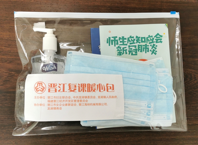 晋江市政协常委、晋江市妇联副主席、龙湖镇新冠病毒感染的肺炎防控指挥部副总指挥丁玉梅说,活动之初,她把学生复课前,为学生免费派发“复课暖心包”的想法说出时,立即得到了龙湖镇党委、政府和晋江经济开发区管委会领导的一致赞同。开发区内企业海纳机械公司表示愿意为本次活动赞助6万个防护口罩,龙湖镇商会也承诺赞助资金4万元,购买免洗洗手液、防疫宣传手册和学习文件袋等物品。
