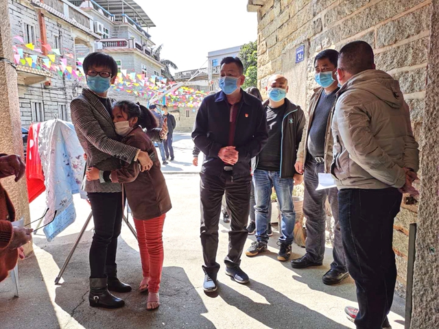丁玉梅(左一)慰问困难学生时,被该学生激动得紧紧抱住。(庄金泉 摄)
