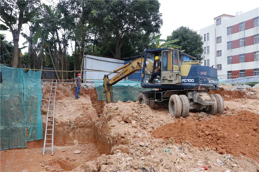与此同时,马甲镇的马甲中学扩建工程也正全面、紧张建设中。在马甲中学学生公寓施工工地上,大型机械轰鸣,挖土机正在进行土方承台开挖,施工人员在一旁用塔尺测量挖掘深度,按要求做好地基挖掘。