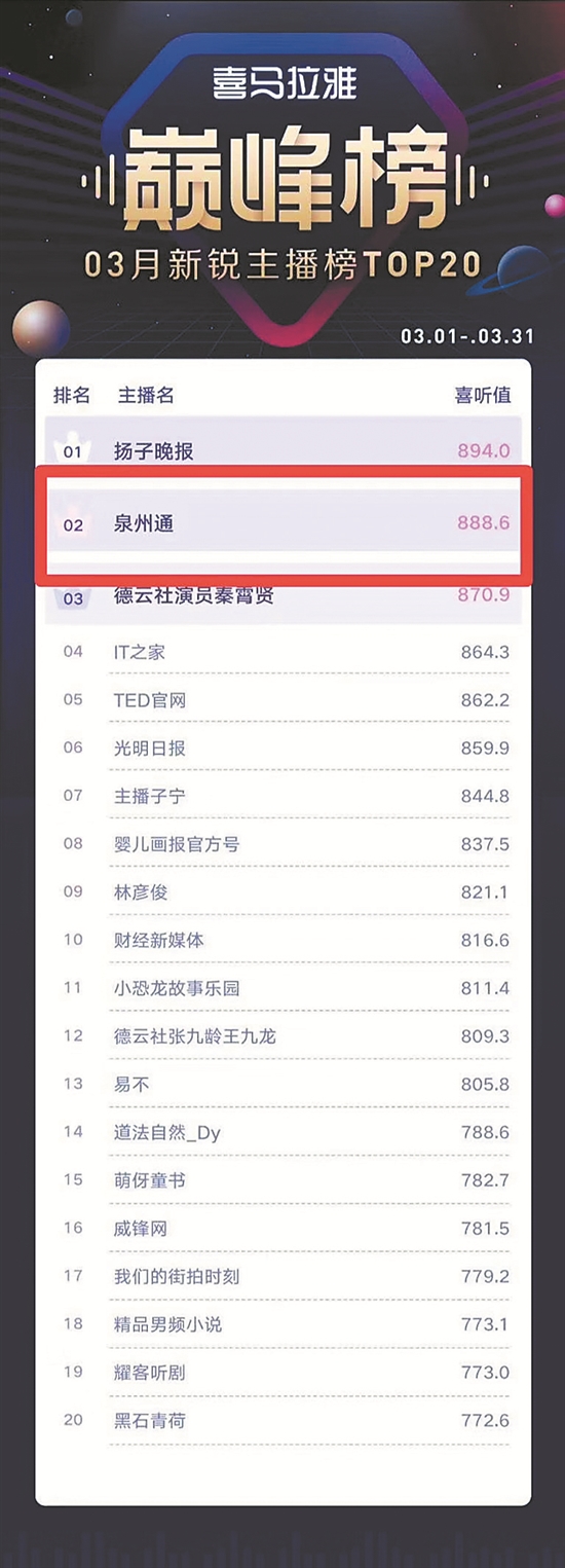 泉州网4月20日讯 近日,喜马拉雅巅峰榜单出炉,3月6日正式入驻喜马拉雅的泉州通登上3月新锐主播榜,位列第二。