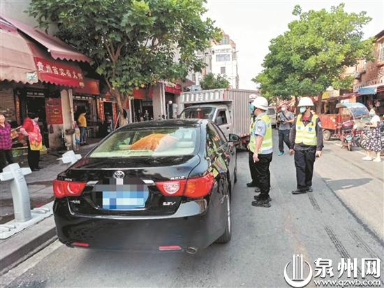 泉州五中位于桂坛巷内,通往该校的多条小巷均较为狭窄,违法停车成为该路段交通畅通的最大阻碍。行动中,民警发现一辆白色小车违停在路边,便依法拍照取证,同时联系车主前来挪车。