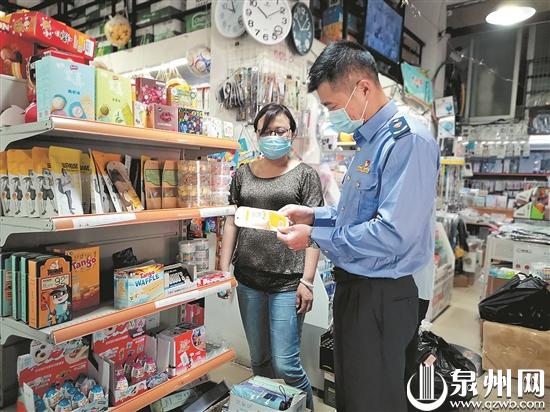 在泉州一中旁一家文具店内,执法人员发现店员未佩戴口罩,于是当场进行纠正,并要求店员必须对每一名进店人员测量体温。随后,执法人员走访了学校周边的奶茶店、超市等,未发现问题。