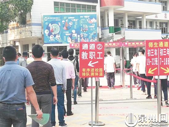 昨日下午,执法人员来到泉州六中,检查该校开学复课准备情况。该校校长吴鹏飞介绍,学校将实施错峰上下学,在校门口设置两道检测,学生通过测温门后,还需由值日老师测体温,每天早晨第一批学生7时20分到校,第二批学生7时30分到校,放学同样分时段错开。
