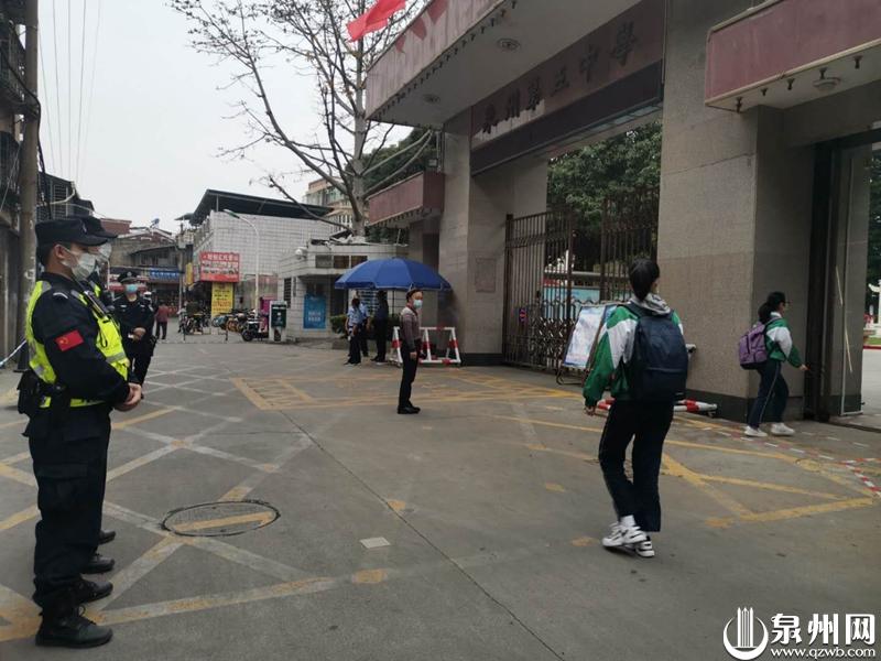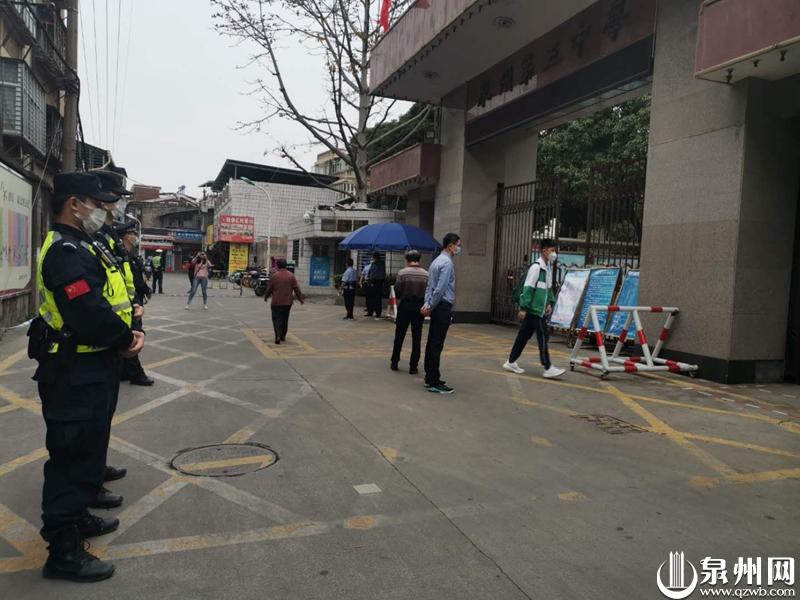 泉州网4月21日讯(记者王丽虹 文/图)初三开学第一天,今日早晨记者在泉州五中桂坛南区和泉州七中金山校区外看到,学校为复课做了充足的准备,鲤城公安分局巡特警反恐大队巡警也在现场维持秩序,学生们有序入校上课。