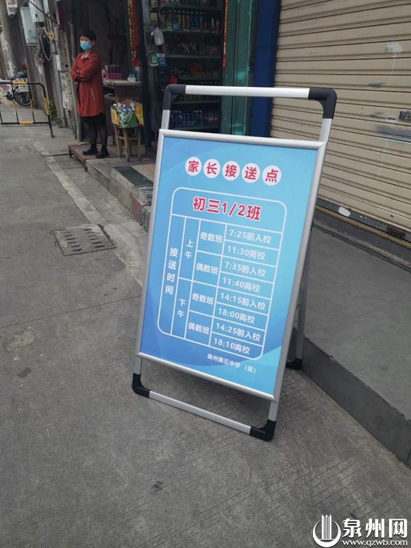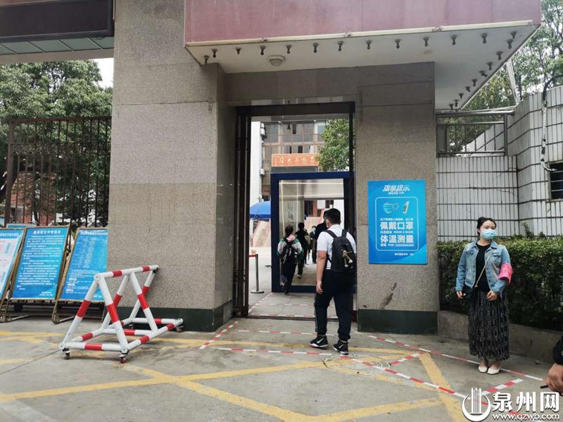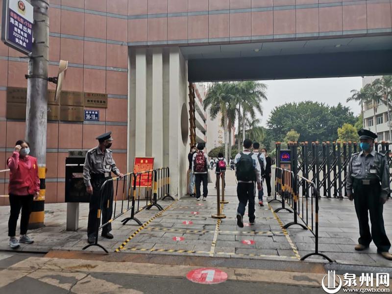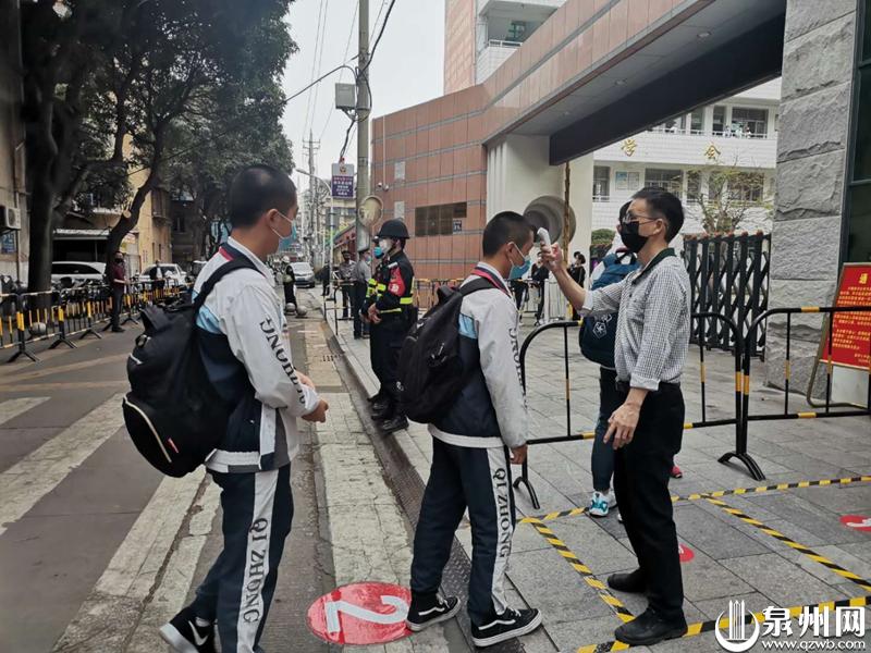 上午7时25分,记者在泉州七中金山校区外看到,校门外设置了4个入校通道,奇数班和偶数班分时段“错峰入校”,每一个进校学生都必须测量体温。