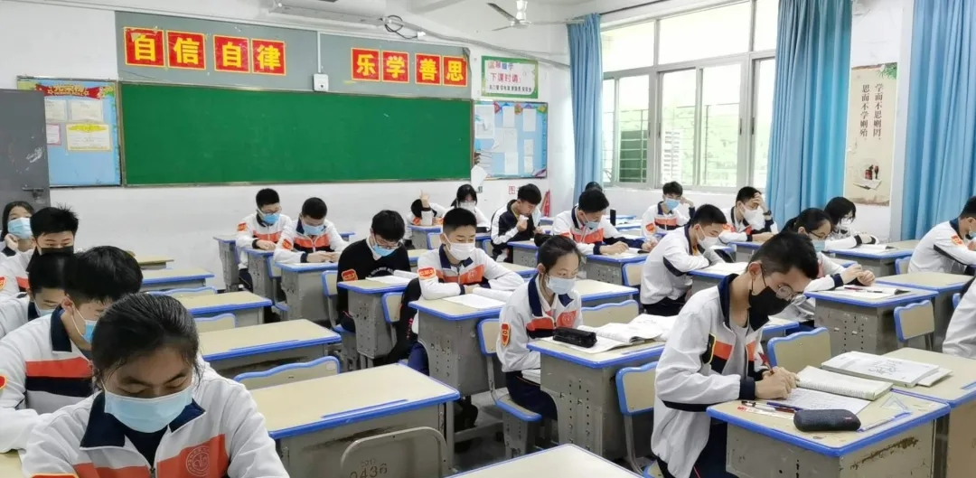 黑板上“不忘初心 砥砺前行”的标语,激励开学复课的初三学子