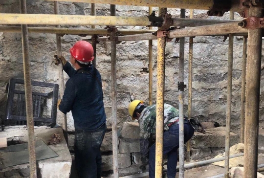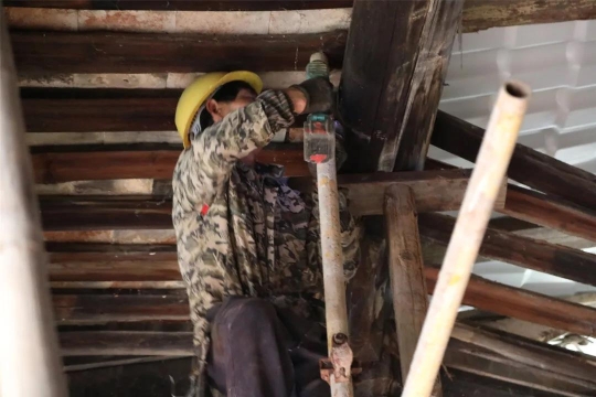据了解,王顺兴信局旧址由奇园、书房和船楼三栋主体建筑组成,记者看到,在船楼和奇园洋楼的附属楼,木结构筑件均出现不同程度槽朽,现场施工人员正使用钢制材料对其进行加固。“待抢险加固完成后,我们将继续向上级部门提交修缮报告,争取早日对其进行整体性修缮。”