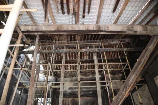 随后,记者跟随区文物保护中心工作人员来到施琅故宅维护加固现场,“我们前期已对建筑的承重木结构、木材材质等进行勘察,发现屋内存在多处不同程度的自然损毁。”区文物保护中心工作人员介绍,该故宅已出现屋顶瓦片、屋梁脱落等现象,存在坍塌风险。为避免出现坍塌,已组织施工人员使用钢制材料对建筑进行结构性加固。