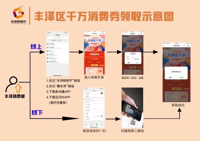 据丰泽区相关负责人介绍,本次活动上千个品牌参与,丰泽区消费者可以通过线上关注“看丰泽”微信公众号、“丰泽购物节”微信公众号、泉州通APP、云闪付APP或相关合作商家微信公众号/APP免费领取,也可以线下到合作商家门店,通过扫描商家海报二维码免费领取。对丰泽区低保、特困、孤儿等贫困群体将上门派送消费券200元/人。