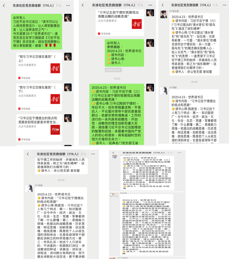 近日,丰泽街道东涂社区党委在微信群里开展线上读书会,鼓励支部党员自主在学习强国读《习近平在宁德》采访实录,结合实际聊心得,并分享到群里,从中汲取信仰的力量、精神的力量、实干的力量,在疫情防控和安全生产大排查工作中坚守初心使命、勇于担当作为。