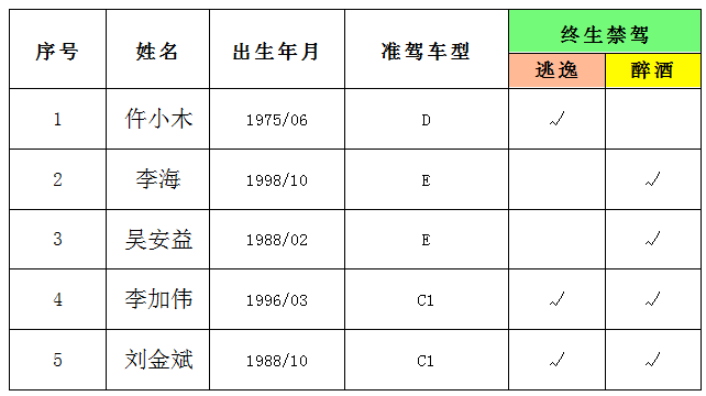泉州网4月24日讯(通讯员赵美媛 记者卢珊珊)近日,泉州市公安局交警支队向社会公布2020年3月份被吊销机动车驾驶证且终生禁驾的5名驾驶人名单。据介绍,其中有1人因交通肇事后逃逸构成犯罪被终生禁驾;2人因醉酒驾驶机动车发生交通事故构成犯罪被终生禁驾;2人因醉酒驾驶机动车发生交通事故且肇事逃逸构成犯罪被终生禁驾。