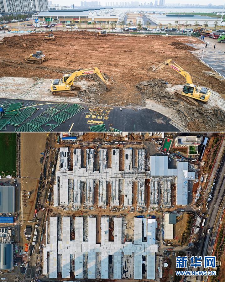这是一张拼版照片:上图是1月26日拍摄的武汉雷神山医院建设工地(无人机照片,新华社记者肖艺九摄);下图是2月5日拍摄的武汉雷神山医院建设工地(无人机照片,新华社记者李贺摄)。经过十昼夜的奋战,2月6日,雷神山医院正式通过武汉市城建和卫健部门的验收,并开始逐步移交。 新华社发